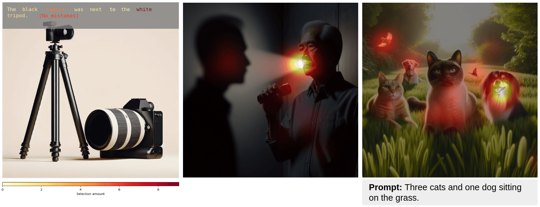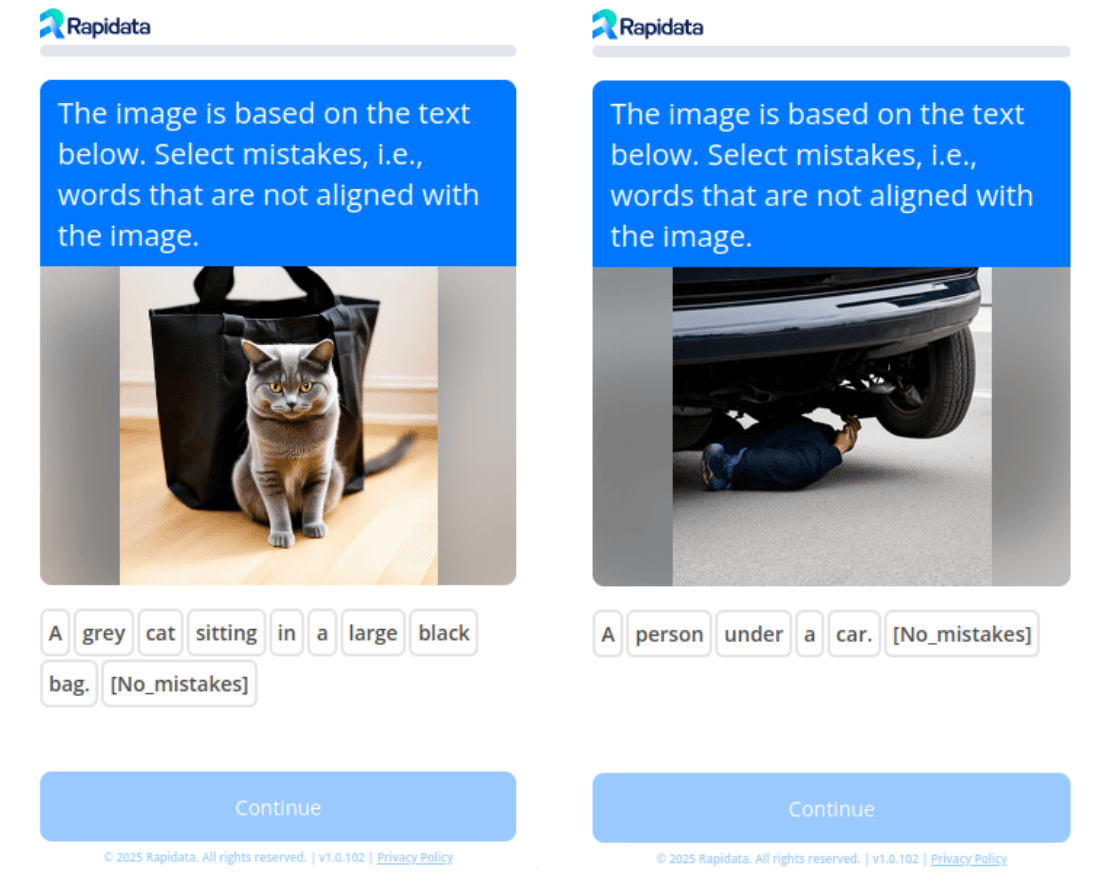 - Misaligned Word Selection To address cases where images fail to fully reflect the prompt, annotators are asked to select words from the prompt that are misaligned or missing in the image, if any. The images below illustrate the interface annotators are shown.