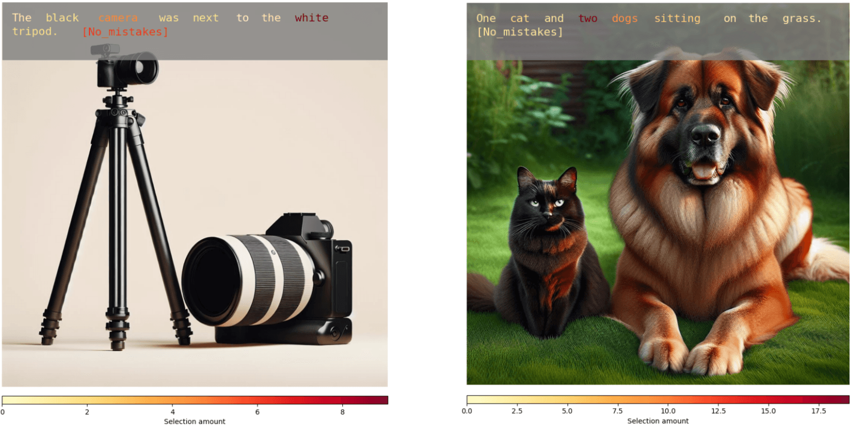 As the Google researchers also note, alignment heatmap annotations are inherently somewhat ambiguous. For example, in the leftmost image above, it is clear that the image has one too few cats and an extra dog. However, what to select in the image to convey that is not immediately clear. In this case, most annotators have selected the dog in the foreground.