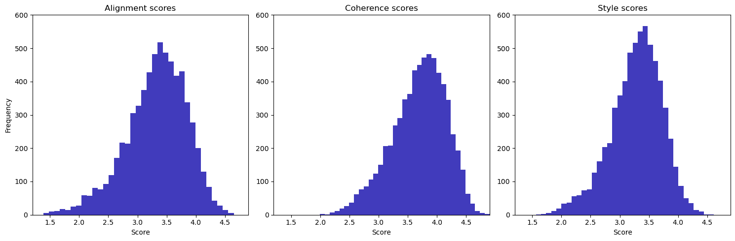 The final style, coherence, and alignment scores were found as the average of the scores assigned by the annotators for each image. Each image was rated at least 20 times for each criteria by different annotators. The distribution of the scores are shown in the figure below. We additionally provide a normalised score between 0 and 1.