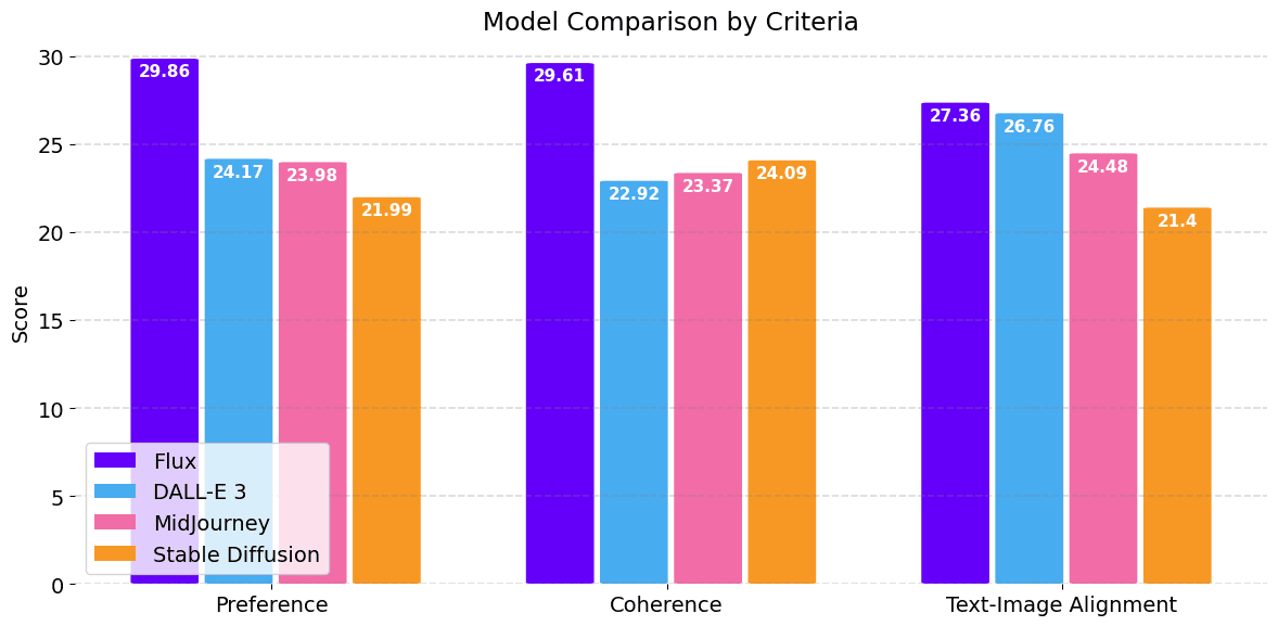 - Flux.1: Top performer across all criterias, and by a significant margin in both style preference and coherence. This firmly cements that this should be the default choice for most applications. This is in line with what newer benchmarks which include Flux.1, such as the leaderboard from Artificial Analysis, report. [14]